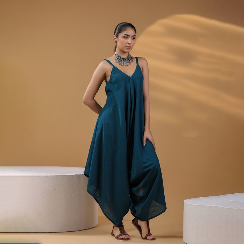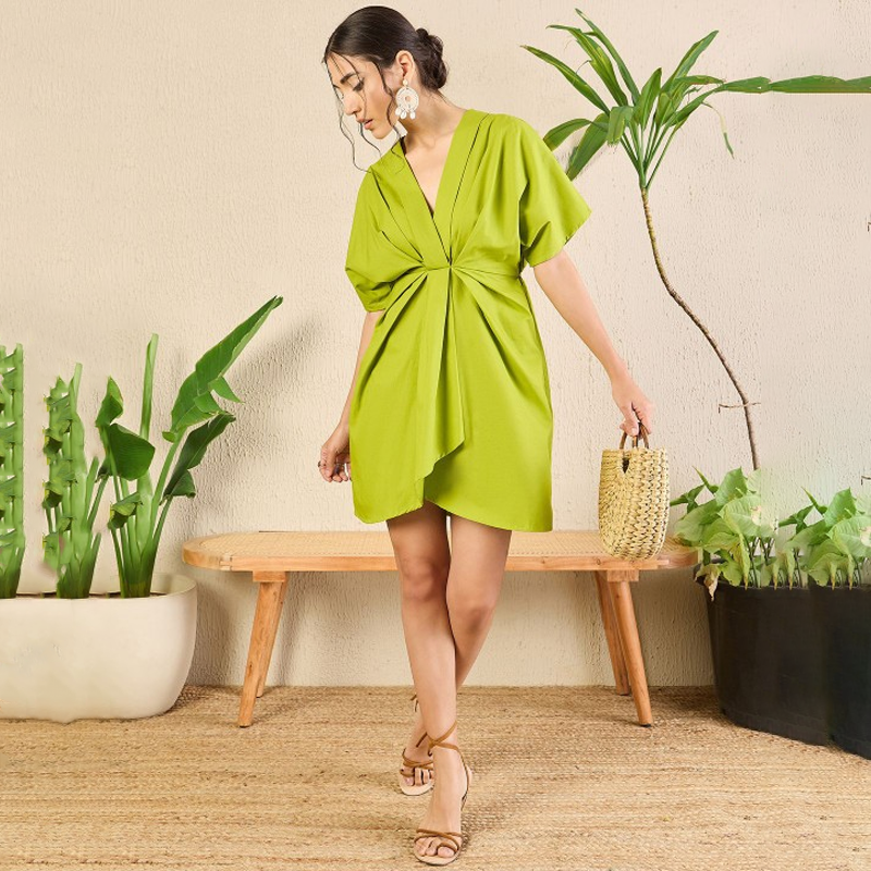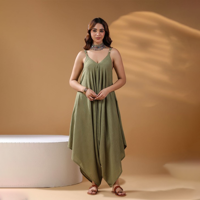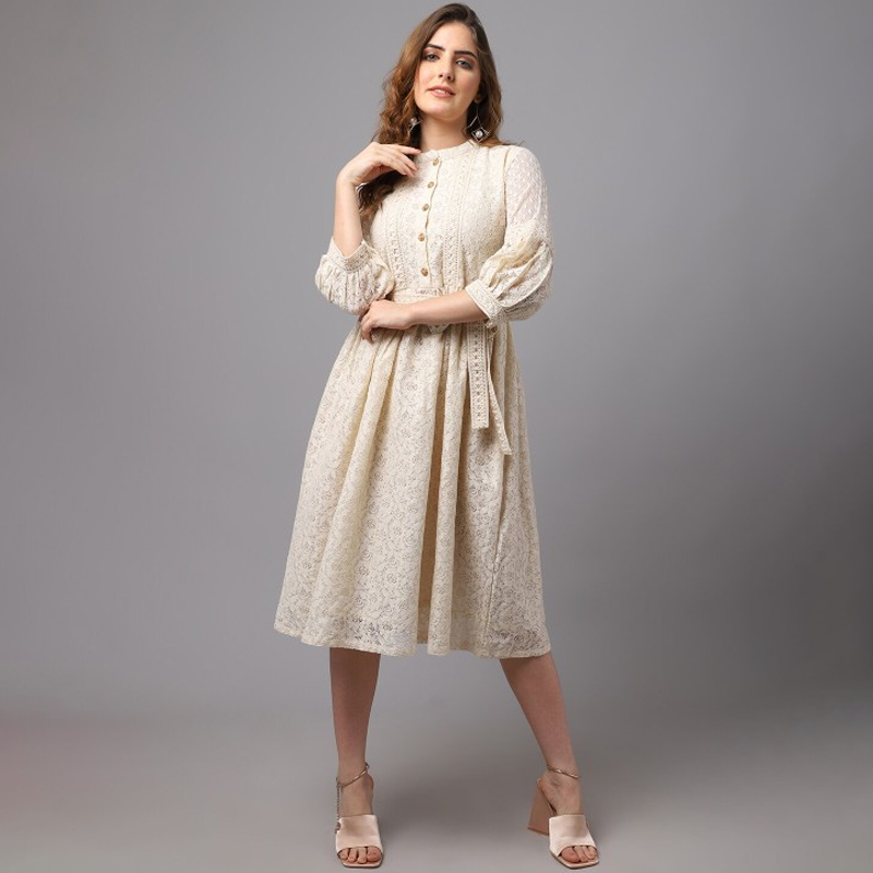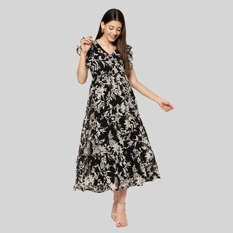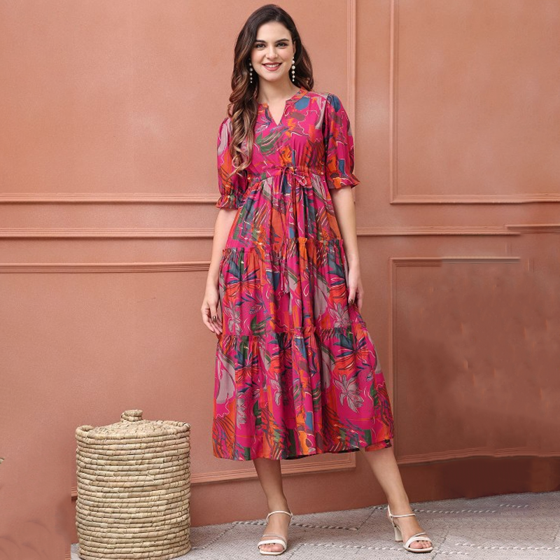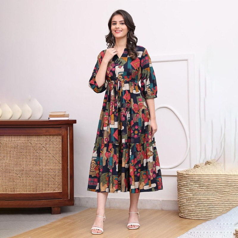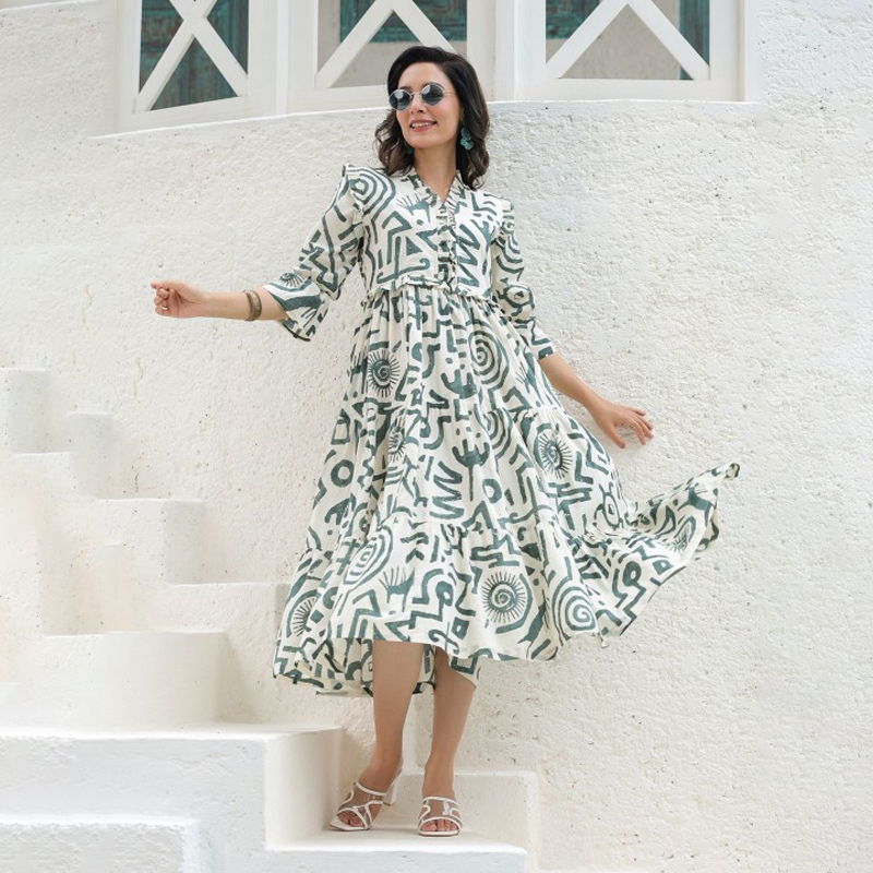 V-Neck Bell Sleeves Pure Cotton Tiered Fit & Flare Midi Dress