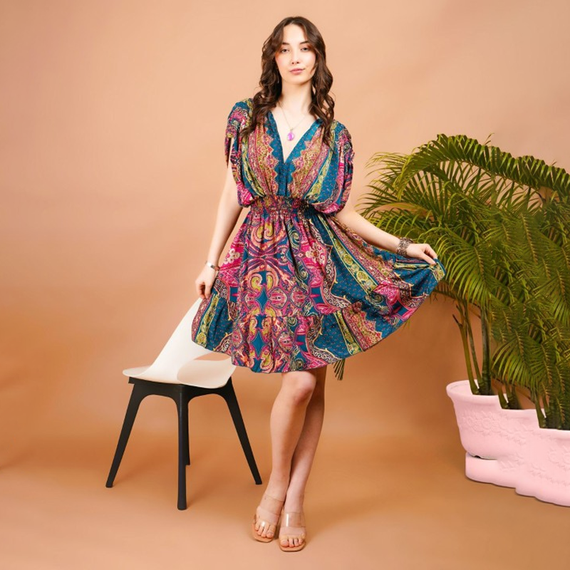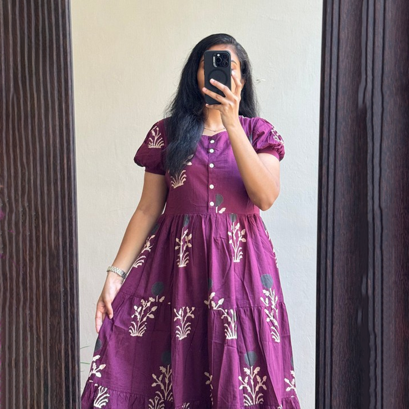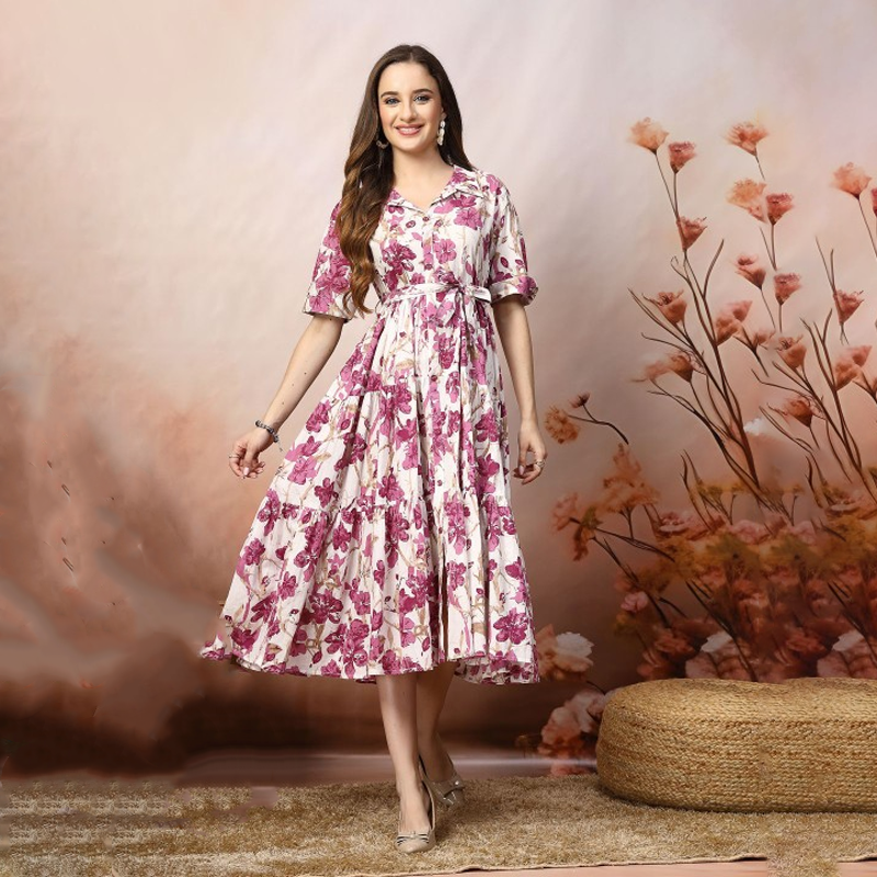 V-Neck Bell Sleeves Pure Cotton Tiered Fit & Flare Midi Dress